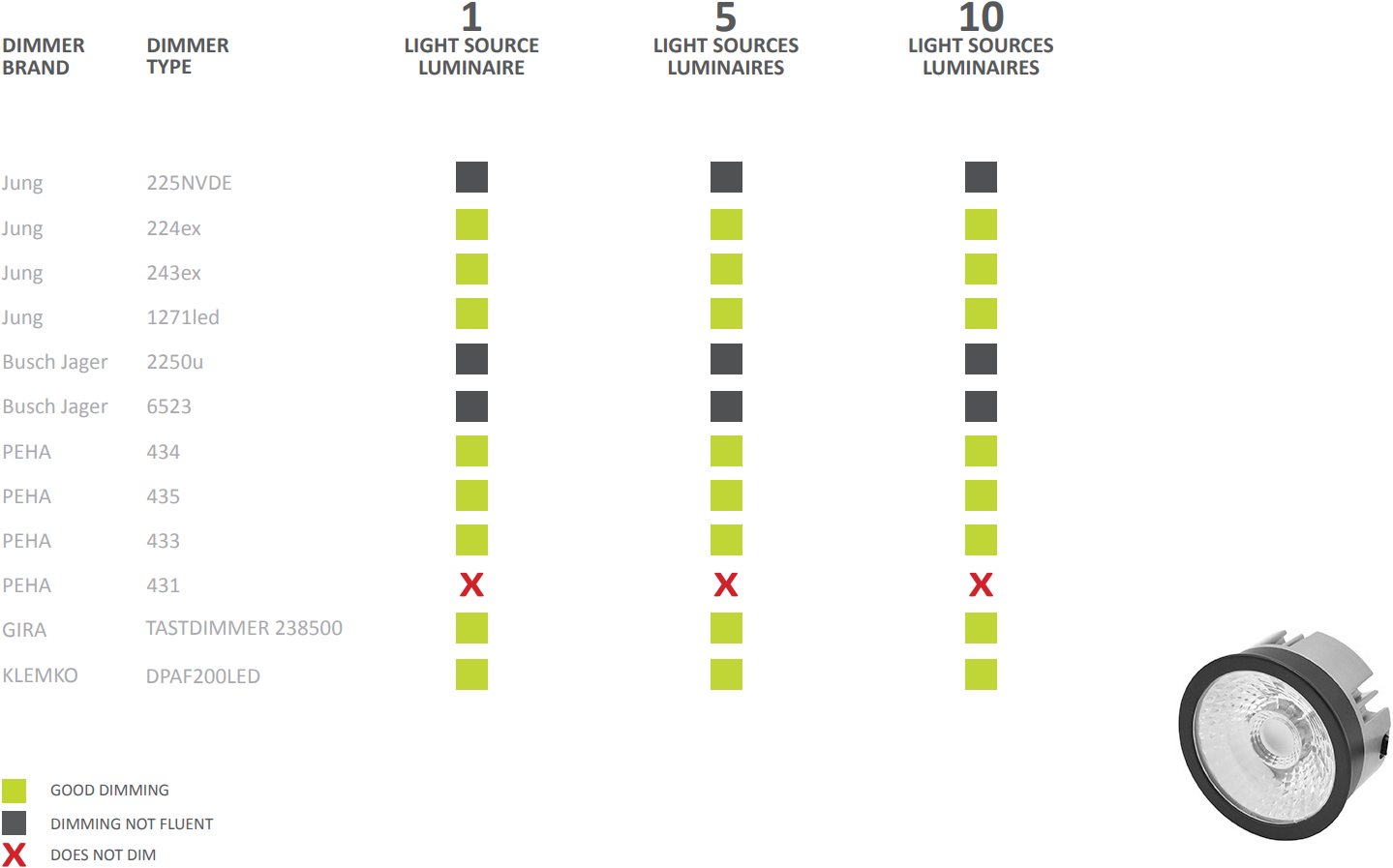 Merk dimmer | Dimmer type | 1 LED Module | 5 LED Modules | 10 LED Modules |