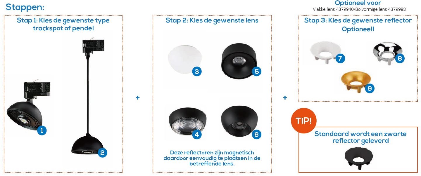 Er kan gekozen worden voor een uitvoering met 3CCT (3.000, 4.000 en 5.700K) of dim-to-warm (2.000-3.000K). Beide varianten zijn dual power (6 of 9W) én triac dimbaar. De armaturen zijn geschikt voor een 3-fase trackrail. Het armatuur kan hier direct in worden geplaatst of kies voor de pendel montage.