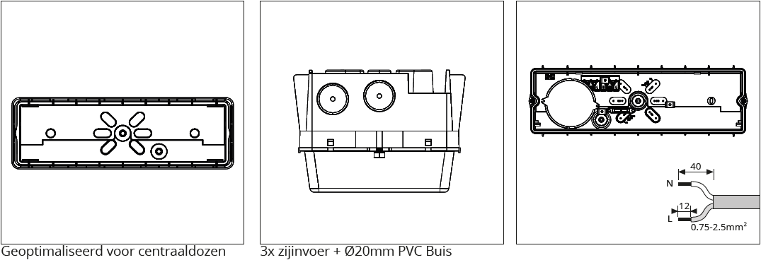 Rechthoek wand- of opbouwarmatuur met opalen prisma diffuser uit UV-gestabiliseerd polycarbonaat. Beschikbaar in 3 kleuren wit (RAL9003), zwart (RAL9004) en antraciet (RAL7016). Opbouwdiepte >77mm. Armatuurbehuizing uit UV-gestabiliseerd polycarbonaat vlamdovend. Armatuurlichtstroom via interne schuifschakelaar in te stellen tussen 295 en 570lm, aansluitvermogen 2,75W tot 5,00W multilumen (4-in-1), met lichtrendement tot 114 lm/W. Lichtkleur 3-in-1 (3-CCT) 2700K (extra warm wit)en 4000K (neutraal wit) instelbaar via schuifschakelaar. Versies met dimbare sensor (step-dim), beweging prioriteit , schemer- daglicht prioriteit. Modulair uit te breiden met master-slave. Algemene kleurweergave-index (CRI) Ra>80. Zeer stabiele binning MacAdam Ellipse =4 (SDCM). Gemiddelde levensduur L90 (tq 25C) = 50.000 uur volgens TM-21 extrapolatie, In-SITU temperatuurtest (ISTMT). Toelaatbare omgevingstemperatuur (ta): -20C ~+ 50C. Beschermklasse (EN 61140): II.Beschermklasse Ingress Protection (EN 60529): IP66, slagvastheid IEC 62262: IK10. Gloeidraadtest conform IEC 60695-2-11: 850C. Met elektronische transformator. Met 3-aderige aansluitklem voor bedrading tot 2,5mm2 vooraansluiting en doorlussen (loop-in-loop-out) van voeding. Geoptimaliseerd voor centraaldozen. Met zijdoorvoer 3x M20. Armaturen voldoen aan de fundamentele eisen van de van toepassing zijnde EU-richtlijnen en productveiligheidswet, zoals EMC, LvD en RoHs. Armaturen zijn voorzien van een CE-markering en zijn geregistreerd door SKG en opgenomen in het Politiekeurmerk Veilig Wonen register.