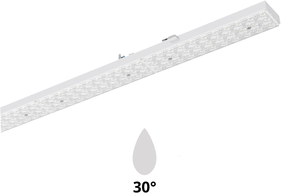 PRX LED-Lichtlijnmodule compatible met bestaande draagrails van lichtlijnsystemen van Signify Philips Maxos G1, TTX400, TTX200, Veko, Norton T5/T8, Lumis, Trilux E-Line T8E, T5E, Regiolux SMT, SDT, Siteco, Zumtobel ZX2. Geschikt voor gebruik in HACCP, IFS versie 6 en/of BRC Global Standard Food versie 7 gecertificeerde bedrijven (DIN 10500). Gereedschapsloos aan het draagprofiel te bevestigen met behulp van roestvrijstalen kliksluitingen. Met mechanische beveiliging tegen verkeerde montage. Bij correcte montage vormt het LED Armatuur één geheel met de draagrail. Het optisch systeem bestaat uit een lenzenoptiek van PMMA met drie op elkaar afgestemde, lichttechnisch werkzame zones, wat een gelijkmatige lichtverdeling en homogene lichtuitstraling garandeert. Stralingskarakteristiek: Zeer brede bundel 120° (Very Wide Beam/VWB), Breedstralend 90° (Wide Beam/WB), Middelbrede Bundel 60° (Middle Beam/ MB), Smalle bundel 30° (Narrow Beam/NB). Aanbevolen installatiehoogte: 4 – 12m. Armatuurfamilie standaard voorzien longlife 100.000 uur drivers met dipswitch schakelaar, waarmee 4-in-1 wattages en lichtstromen ingesteld kan worden (multilumen). Armatuurlichtstroom tussen 4.880 tot 9.150lm, aansluitvermogen 32,00W tot 60,00W. Verkrijgbaar in lichtkleur 3000K (warm wit), 4000K (neutraal wit), 5000K (koud wit) of 6500K (daglicht). Maximum efficacy 153 lm/w. Algemene kleurweergave-index (CRI) Ra >80. Zeer stabiele binning MacAdam Ellipse =2 (SDCM). Gemiddelde levensduur L90(tq 25°C) = >50.000, L80(tq 25°C) = >100.000 volgens TM-21 extrapolatie, In-SITU temperatuurtest (ISTMT). Toelaatbare omgevingstemperatuur (ta): -25°C ~ + 50°C. Beschermklasse (EN 61140): I. Beschermklasse Ingress Protection (EN 60529): IP40, slagvastheid IEC 62262: IK02. Beoordeling van de gevaren van blauw licht (EN 62471): RG1 , geen risico. Gloeidraadtest conform IEC 606952-11: 650°C. Met elektronische transformator, origineel aansluitklem/ connector per merk. Versies met DALI, en voorzieningen voor de aansluiting van lichtmanagement systemen op basis van DALI. Noodverlichting manuele of autotest, continue, niet-continue, noodverlichting als standbyverlichting. Armaturen voldoen aan de fundamentele eisen van de van toepassing zijnde EU-richtlijnen en productveiligheidswet, zoals EMC, LvD en RoHs. Armaturen zijn voorzien van een CE-markering en ENEC-keuring.