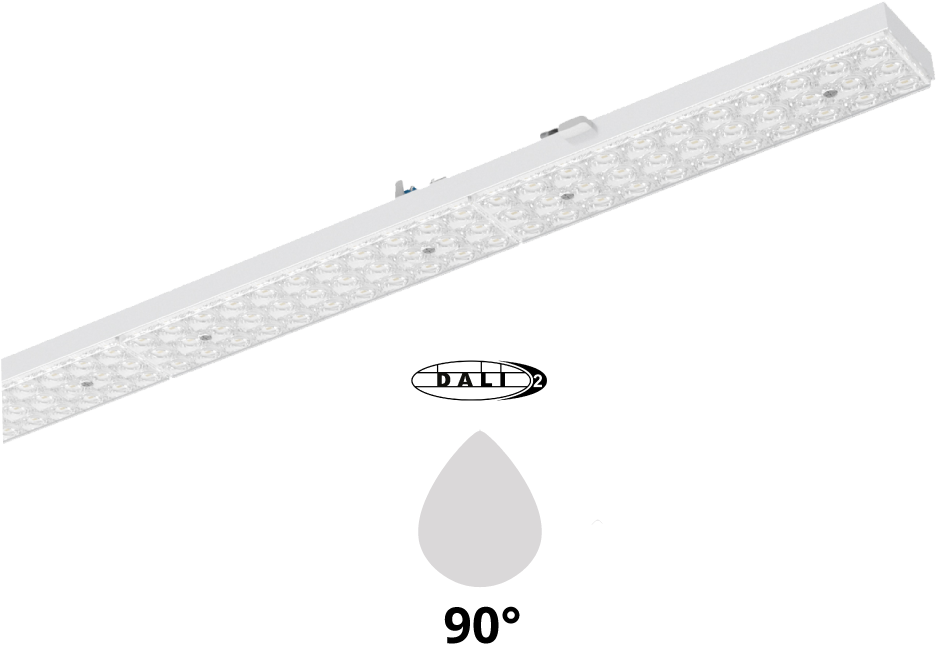 LED Lichtlijnsysteem geschikt voor toepassing in bedrijfshallen, productieruimten, fabriekshallen en winkels. Geschikt voor gebruik in HACCP, IFS versie 6 en/of BRC Global Standard Food versie 7 gecertificeerde bedrijven (DIN 10500). Aluminium draagprofielen beschikbaar in 3 lengtes: 4584mm (3 units), 3056mm (2 units) en 1528mm (1 unit) en standaard voorzien van 7x2,5mm2 doorvoerbedrading. Gereedschapsloos aan het draagprofiel te bevestigen met behulp van roestvrijstalen kliksluitingen. Het optisch systeem bestaat uit een lenzenoptiek van PMMA met drie op elkaar afgestemde, lichttechnisch werkzame zones, wat een gelijkmatige lichtverdeling en homogene lichtuitstraling garandeert. Stralingskarakteristiek: Zeer brede bundel 120 (Very Wide Beam/VWB), Breedstralend 90 (Wide Beam/WB), Middelbrede Bundel 60 (Middle Beam/ MB), Smalle bundel 30 (Narrow beam /NB). Aanbevolen installatiehoogte: 4 12m. Armatuurfamilie standaard voorzien longlife 100.000 uur flikkervrije drivers met dipswitch schakelaar, waarmee 4-in-1 wattages en lichtstromen ingesteld kan worden (multilumen). Armatuurlichtstroom tussen 4.880 tot 9.150lm, aansluitvermogen 32,00W tot 60,00W. Verkrijgbaar in lichtkleur 3000K (warm wit), 4000K (neutraal wit), 5000K (koud wit) of 6500K (daglicht). Maximum efficacy 153 lm/w. Algemene kleurweergaveindex (CRI) Ra >80. Zeer stabiele binning MacAdam Ellipse =3 (SDCM). Gemiddelde levensduur L90(tq 25C) = >50.000, L80(tq 25C) = >100.000 volgens TM-21 extrapolatie, In-SITU temperatuurtest (ISTMT). Toelaatbare omgevingstemperatuur (ta): -25C ~ + 50C. Beschermklasse (EN 61140): I. Beschermklasse Ingress Protection (EN 60529): IP40, slagvastheid IEC 62262: IK02. Beoordeling van de gevaren van blauw licht (EN 62471): RG0 , geen risico. Gloeidraadtest conform IEC 60695-2-11: 850C. Versies met DALI, en voorzieningen voor de aansluiting van lichtmanagement systemen op basis van DALI. Noodverlichting manuele of autotest, continue, nietcontinue, noodverlichting als standby-verlichting. Armaturen voldoen aan de fundamentele eisen van de van toepassing zijnde EU-richtlijnen en productveiligheidswet, zoals EMC, LvD en RoHs. Armaturen zijn voorzien van een CE-markering en ENEC-keuring.