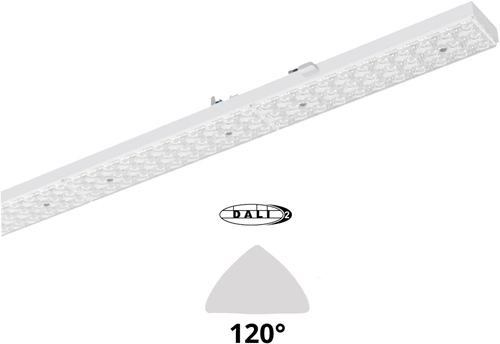 LED Lichtlijnsysteem geschikt voor toepassing in bedrijfshallen, productieruimten, fabriekshallen en winkels. Geschikt voor gebruik in HACCP, IFS versie 6 en/of BRC Global Standard Food versie 7 gecertificeerde bedrijven (DIN 10500). Aluminium draagprofielen beschikbaar in 3 lengtes: 4584mm (3 units), 3056mm (2 units) en 1528mm (1 unit) en standaard voorzien van 7x2,5mm2 doorvoerbedrading. Gereedschapsloos aan het draagprofiel te bevestigen met behulp van roestvrijstalen kliksluitingen. Het optisch systeem bestaat uit een lenzenoptiek van PMMA met drie op elkaar afgestemde, lichttechnisch werkzame zones, wat een gelijkmatige lichtverdeling en homogene lichtuitstraling garandeert. Stralingskarakteristiek: Zeer brede bundel 120 (Very Wide Beam/VWB), Breedstralend 90 (Wide Beam/WB), Middelbrede Bundel 60 (Middle Beam/ MB), Smalle bundel 30 (Narrow beam /NB). Aanbevolen installatiehoogte: 4 12m. Armatuurfamilie standaard voorzien longlife 100.000 uur flikkervrije drivers met dipswitch schakelaar, waarmee 4-in-1 wattages en lichtstromen ingesteld kan worden (multilumen). Armatuurlichtstroom tussen 4.880 tot 9.150lm, aansluitvermogen 32,00W tot 60,00W. Verkrijgbaar in lichtkleur 3000K (warm wit), 4000K (neutraal wit), 5000K (koud wit) of 6500K (daglicht). Maximum efficacy 153 lm/w. Algemene kleurweergaveindex (CRI) Ra >80. Zeer stabiele binning MacAdam Ellipse =3 (SDCM). Gemiddelde levensduur L90(tq 25C) = >50.000, L80(tq 25C) = >100.000 volgens TM-21 extrapolatie, In-SITU temperatuurtest (ISTMT). Toelaatbare omgevingstemperatuur (ta): -25C ~ + 50C. Beschermklasse (EN 61140): I. Beschermklasse Ingress Protection (EN 60529): IP40, slagvastheid IEC 62262: IK02. Beoordeling van de gevaren van blauw licht (EN 62471): RG0 , geen risico. Gloeidraadtest conform IEC 60695-2-11: 850C. Versies met DALI, en voorzieningen voor de aansluiting van lichtmanagement systemen op basis van DALI. Noodverlichting manuele of autotest, continue, nietcontinue, noodverlichting als standby-verlichting. Armaturen voldoen aan de fundamentele eisen van de van toepassing zijnde EU-richtlijnen en productveiligheidswet, zoals EMC, LvD en RoHs. Armaturen zijn voorzien van een CE-markering en ENEC-keuring.