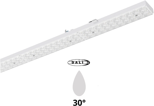 LED Lichtlijnsysteem geschikt voor toepassing in bedrijfshallen, productieruimten, fabriekshallen en winkels. Geschikt voor gebruik in HACCP, IFS versie 6 en/of BRC Global Standard Food versie 7 gecertificeerde bedrijven (DIN 10500). Aluminium draagprofielen beschikbaar in 3 lengtes: 4584mm (3 units), 3056mm (2 units) en 1528mm (1 unit) en standaard voorzien van 7x2,5mm2 doorvoerbedrading. Gereedschapsloos aan het draagprofiel te bevestigen met behulp van roestvrijstalen kliksluitingen. Het optisch systeem bestaat uit een lenzenoptiek van PMMA met drie op elkaar afgestemde, lichttechnisch werkzame zones, wat een gelijkmatige lichtverdeling en homogene lichtuitstraling garandeert. Stralingskarakteristiek: Zeer brede bundel 120 (Very Wide Beam/VWB), Breedstralend 90 (Wide Beam/WB), Middelbrede Bundel 60 (Middle Beam/ MB), Smalle bundel 30 (Narrow beam /NB). Aanbevolen installatiehoogte: 4 12m. Armatuurfamilie standaard voorzien longlife 100.000 uur flikkervrije drivers met dipswitch schakelaar, waarmee 4-in-1 wattages en lichtstromen ingesteld kan worden (multilumen). Armatuurlichtstroom tussen 4.880 tot 9.150lm, aansluitvermogen 32,00W tot 60,00W. Verkrijgbaar in lichtkleur 3000K (warm wit), 4000K (neutraal wit), 5000K (koud wit) of 6500K (daglicht). Maximum efficacy 153 lm/w. Algemene kleurweergaveindex (CRI) Ra >80. Zeer stabiele binning MacAdam Ellipse =3 (SDCM). Gemiddelde levensduur L90(tq 25C) = >50.000, L80(tq 25C) = >100.000 volgens TM-21 extrapolatie, In-SITU temperatuurtest (ISTMT). Toelaatbare omgevingstemperatuur (ta): -25C ~ + 50C. Beschermklasse (EN 61140): I. Beschermklasse Ingress Protection (EN 60529): IP40, slagvastheid IEC 62262: IK02. Beoordeling van de gevaren van blauw licht (EN 62471): RG0 , geen risico. Gloeidraadtest conform IEC 60695-2-11: 850C. Versies met DALI, en voorzieningen voor de aansluiting van lichtmanagement systemen op basis van DALI. Noodverlichting manuele of autotest, continue, nietcontinue, noodverlichting als standby-verlichting. Armaturen voldoen aan de fundamentele eisen van de van toepassing zijnde EU-richtlijnen en productveiligheidswet, zoals EMC, LvD en RoHs. Armaturen zijn voorzien van een CE-markering en ENEC-keuring.