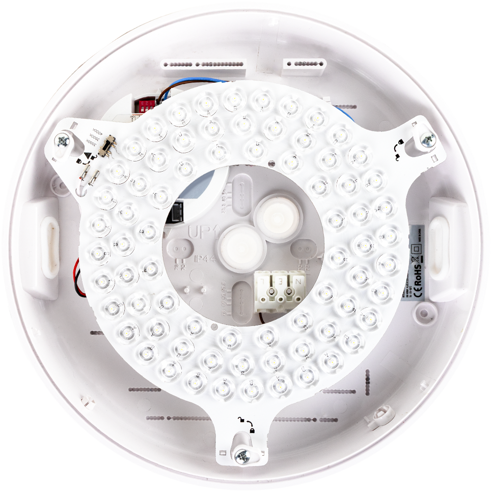 Ronde wand- of opbouwarmatuur met opalen kap, gemaakt van Polycarbonaat voor gebruik in binnenruimten. Met ronde diffuser. Beschikbaar in diameters (mm) van 270 en 340. Beschikbaar in 2 kleuren wit (RAL9003), zwart (RAL9004). Opbouwdiepte 63mm. Armatuurbehuizing uit UV-gestabiliseerd polycarbonaat vlamdovend. Armatuurlichtstroom via interne schuifschakelaar in te stellen tussen 375-1100lm voor 270 en 750-2300lm voor 340 , aansluitvermogen 4-9W 270 en 8-18W 340, multilumen (4-in-1) met lichtrendement tot 132 lm/W. Lichtkleur 2-in-1 (2-CCT) 2200K (amber extra warm), 2700K (extra warmwit) of 3-in-1 (3-CCT) 3000K, 3500K (warmwit) 4000K (neutraal wit) gereedschaploos instelbaar via schuifschakelaar op PCB. Versies met reguliere 220-220V spanning en 24V-42V AC/DC, DALI2 driver, dimbare sensor (step-dim), beweging prioriteit RF, aanwezigheidsprioriteit PIR, schemerdaglichtprioriteit en/of gentegreerde noodvoorziening conform EN-1838. Modulair uit te breiden met master-slave. Algemene kleurweergaveindex (CRI) Ra >80. Zeer stabiele binning MacAdam Ellipse 3 (SDCM). Gemiddelde levensduur L90(tq 25C) = 54.000 volgens TM-21 extrapolatie, In-SITU temperatuurtest (ISTMT). Toelaatbare omgevingstemperatuur (ta): -20C ~ + 45C, met nood, en/of nood-sensor -10C ~ + 40C. Beschermklasse (EN 61140): II. Beschermklasse Ingress Protection (EN 60529): IP64, slagvastheid IEC 62262: IK10. Gloeidraadtest conform IEC 60695-2-11: 850C. Met elektronische transformator. Met 3-aderige / 5-aderige aansluitklem voor bedrading tot 2,5m voor aansluiting en doorlussen (loop-in-loop-out) van voeding. Geschikt voor centraal- en hollewanddozen. Met zijdoorvoer M20. Armaturen voldoen aan de fundamentele eisen van de van toepassing zijnde EU-richtlijnen en productveiligheidswet, zoals EMC, LvD en RoHs. Armaturen zijn voorzien van een CE-markering.