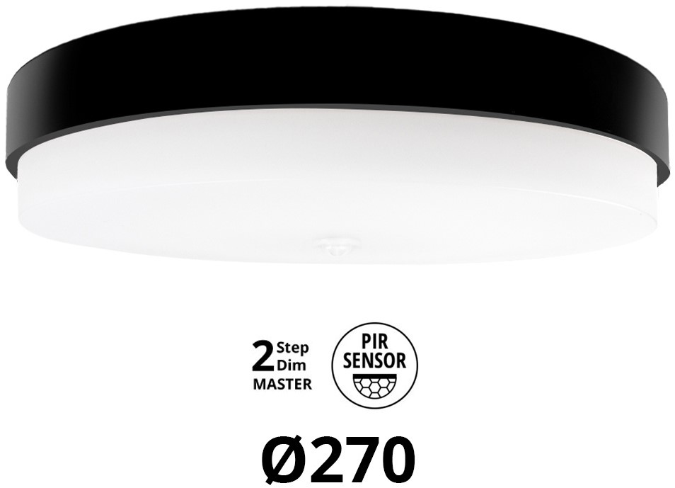 Pragmalux LED Plafonnière / Wandarmatuur Dura-S Zwart Ø270 IP64 IK10 4-9W 375-1000lm 2200K-2700K 2-CCT 2-step dim (100-10%) master + PIR Sensor