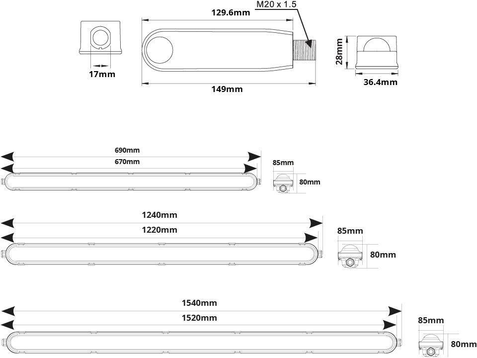 Eenvoudige gereedschapsloze montage dankzij prefab installatie kabels en wartels (M20). Beschikbaar in 60cm, 120cm en 150cm en lumenpakketten van 1250lm tot 10.200lm. LED-lichtbron heeft een verwachte levensduur van 100.000, waarmee substantieel wordt bespaard op onderhouds- en vervangingskosten. Standaard voorbereid met 5x2,5mm2 doorvoerbedrading, waarmee armaturen gekoppeld kunnen worden. Versies met PIR, DALI, Noodverlichting, bewegingssensoren, step-dim(hoog-laag), en voorzieningen voor de aansluiting van lichtmanagement systemen.