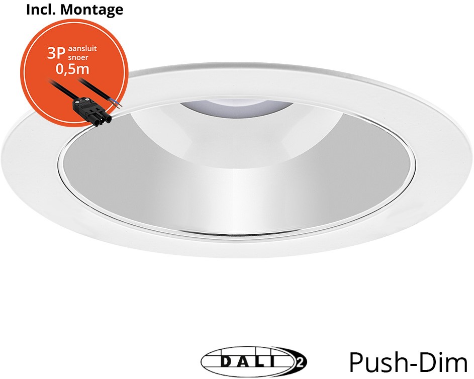 Ronde LED downlighter met aluminium reflector met klemveren. Met gesloten opalen diffusor vervaardigd uit PMMA en behuizing uit polycarbonaat met vlakke plafondring (RAL9003 of RAL9005). Geschiktvoor montage in plafonds met inbouwopeningen, lamellensystemen, systeemplafonds met verborgen en zichtbare draagprofielen. Geschikt voor inbouwopeningen van 125, 150 en 200 Inbouwdiepte =100mm. Armatuurlichtstroom 1450 tot 2300lm, aansluitvermogen 14W tot 20W met lichtrendement van 122 lm/W. Beschikbaar in kleurtemperatuur (CCT) 3000K (warm wit), 4000K (neutraal wit) en 5700K (daglicht). Algemene kleurweergave-index(CRI) Ra >80. Zeer stabiele binning MacAdam Ellipse <4 (SDCM). Gemiddeldelevensduur L90(tq 25C) = 50.000 volgens TM-21 extrapolatie, In-SITU temperatuurtest (ISTMT). Toelaatbare omgevingstemperatuur (ta): -20C ~+ 40C. Beschermklasse (EN 61140): II. Beschermklasse Ingress Protection(EN 60529): IP54, slagvastheid IEC 62262: IK06. Gloeidraadtest conform IEC60695-2-11: 650C. Met elektronische transformator, schakelbaar vermogen, met geintegreerde trekontlasting. Versies met DALI, push&dim. Met 2-aderige aansluitklem voor bedrading tot 2,5mm2 voor aansluiting en doorlussen (loop-in-loop-out) van voeding of versies met 3P aansluitsnoer. Armaturen voldoen aan de fundamentele eisen van de van toepassing zijnde EU-richtlijnen en productveiligheidswet, zoals EMC, LvD en RoHs. Armaturen zijn voorzien van een CE-markering