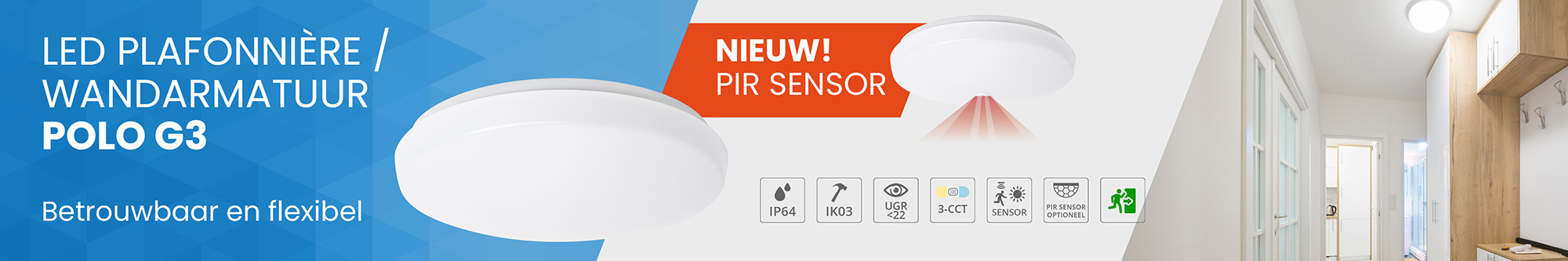 Pragmalux LED Plafonniere / Wandarmatuur Polo G3 IP64 12W 3000K-6000K 3-CCT 1000-1100lm 280 (2x18W) +Bewegingssensor & Noodmodule 3 uur manueel