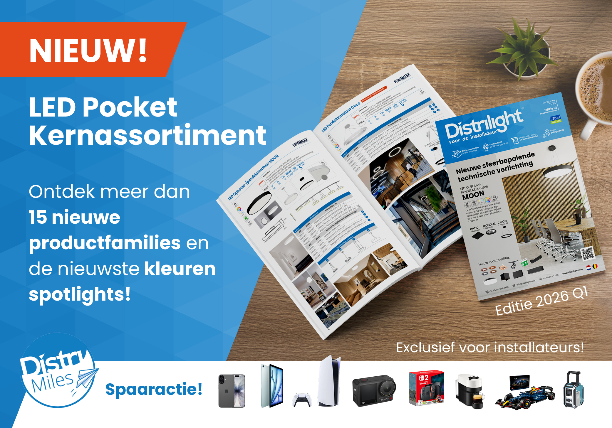 Spaaractie februari t/m mei. 1,- Pragmalux omzet = 2 DistriMiles. Voorwaarden: geldig bij gefactureerde actieperiode van 09-02-2026 tot en met 30-05-2025, bij een totale cumulatief gefactureerde omzet in actieperiode. Niet te combineren met andere acties of geldig indien er jaarafspraken zijn gemaakt. Cadeau wordt toegereikt nadat alle facturen in actieperiode zijn voldaan. Maximaal 1 Distrimiles cadeau per klant. Distrimiles i.c.m. projectregistratie. Er worden geen uitzonderingen gemaakt op bovenstaande actievoorwaarden.